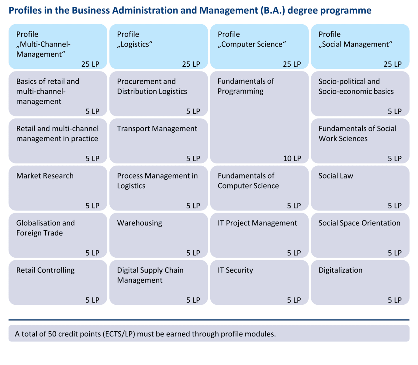 You can choose from a total of four different profiles: Multi-Channel Management, Logistics, Social Management and Sports Management. Each of these profiles comprises four or five thematically related modules that provide you with in-depth knowledge in the respective area.