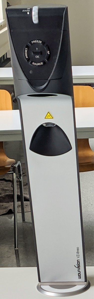 Drücke die Taste "DOC-CAM" auf dem Bedienpanel am Tisch. Klappe den Arm der Dokumentenkamera hoch (bitte nicht nach rechts oder links drehen), die Einschaltung der Kamera erfolgt automatisch.