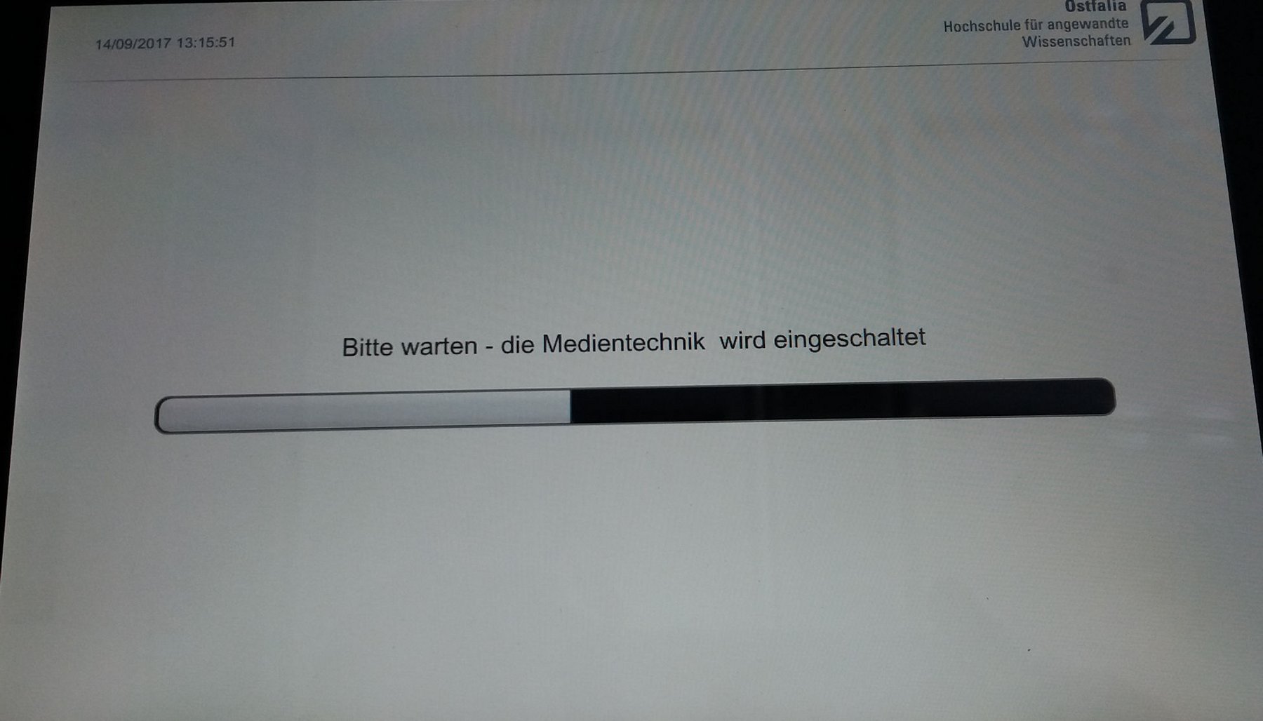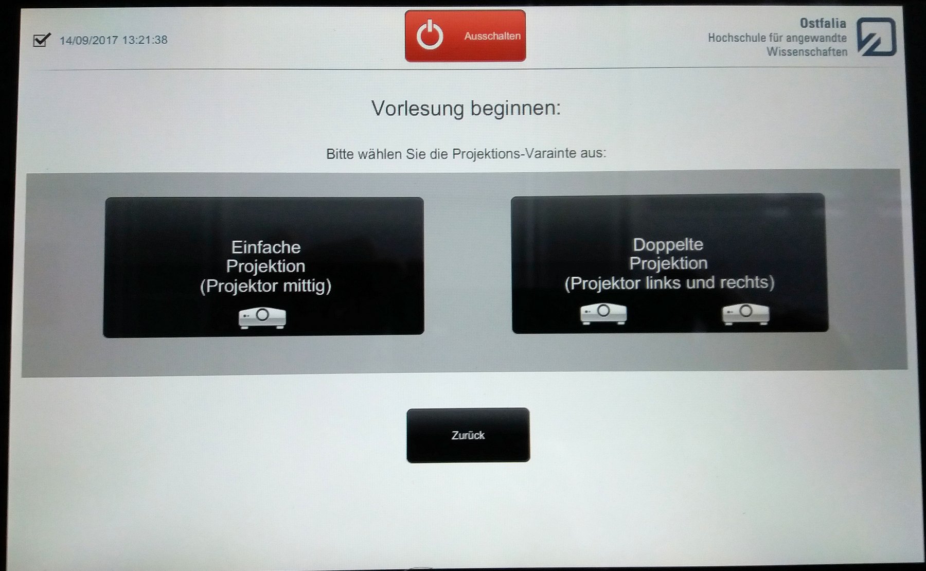Die Bedienung der Beamer und der Leinwände ist dank des Touch Bedienfeldes sehr einfach und selbsterklärend. Am Medientisch bitte die rechte obere Schublade herausziehen. Den Touch Bildschirm ggfs. durch das Berühren mit den Fingerspitzen aktivieren. Es erscheint in der Regel der Anfangbildschirm. Falls nicht, ist die Anlage nicht ausgeschaltet worden und bereits ein Präsentationsszenario voreingestellt. Dann bitte den Ausschaltbutton auf dem Bildschirm betätigen, um die gewünschte Präsentationsart, nach dem Herunterfahren der Technik, erneut einzustellen. Wie du bemerkst, ist das Menü selbsterklärend.