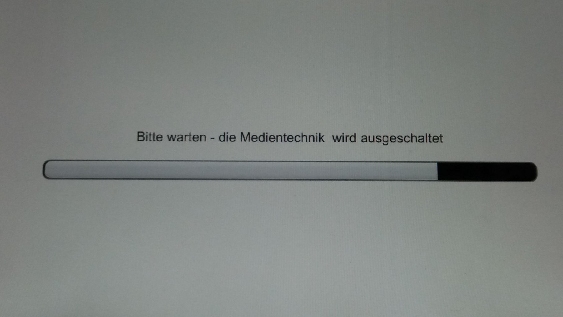 Am Ende der Veranstaltung bitte alle Geräte (Mikrofone) ausschalten und wegschließen und die Medientechnik ausschalten (Ausschaltbutton).