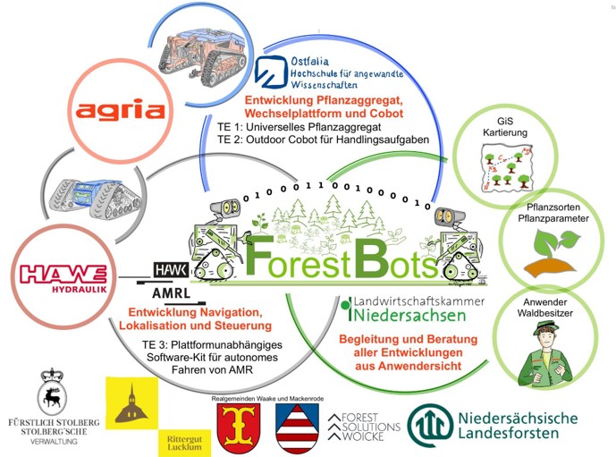 Die folgende Grafik zeigt die Zusammenarbeit der Verbundpartner Ostfalia Hochschule mit HAWK Göttingen (externer Link, öffnet neues Fenster) (externer Link, öffnet neues Fenster) und Landwirtschaftskammer Niedersachsen (externer Link, öffnet neues Fenster) (externer Link, öffnet neues Fenster) mit den beiden AMR sowie den assoziierten Partnern: Agria-Werke GmbH, Niedersächsische Landesforsten, Realgemeinde Mackenrode, Fürstlich Stolberg Stolberg'sche Forstverwaltung, Güterverwaltung Reinau, Forest Solutions Woicke und Realgemeinde Waake:
